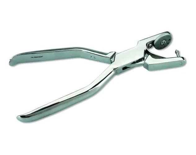 Pinza articulada con 5 orificios de distinto tamaño que permite perforar el dique de goma con el grosor necesario.